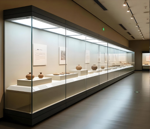 博物馆沿墙通柜,顾名思义,指的是紧贴博物馆展厅墙面、长度贯通较大范围(通常是一整面墙或一个完整的展区)的大型玻璃陈列柜。
